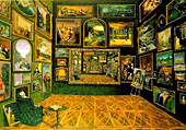 En El gabinete de un aficionado se construye la historia de una fantasía especular. La novela gira en torno a un cuadro que representa una sala repleta de las obras de la colección de un rico fabricante de cerveza. Este cuadro no reproduce solamente otros cuadros, sino que se contiene a sí mismo, conteniendo otra vez los mismos cuadros y otra vez a sí mismo hasta que el tamaño de la tela lo permite, sugiriendo sin embargo un juego de espejos hasta el infinito. Se trata de una vertiginosa maquinaria de copias. Las pequeñas variaciones introducidas a cada repetición por el artista son interpretadas por los críticos mencionados en la novela como gestos de una melancolía provocada por la imposibilidad de ser autor en un mundo plagado de reproducciones; un vestigio de aquella necesidad de autoría propia y auténtica que había abocado a Gaspard Winckler al cuchillo y la sangre.