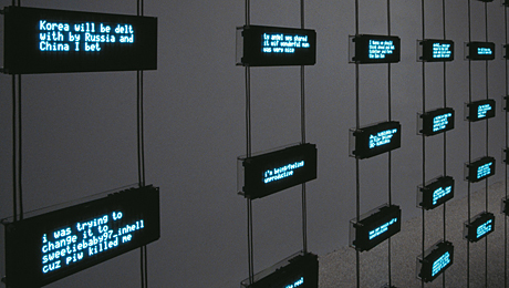 Hay, efectivamente, un movimiento doble: por un lado, una confrontación con la conversación oral, y ahora escrita, y con los entornos tecnológicos y, por otro, una puesta en acción de estos entornos tecnológicos (radiofónicos, cinematográficos, etc.) en un lugar. En la dinámica de la exposición se encuentra algo a medio camino entre la ambivalencia y el desvío. Los medios de comunicación se desvían para suscitar modalidades de conversaciones renovadas en un espacio de co-presencia.